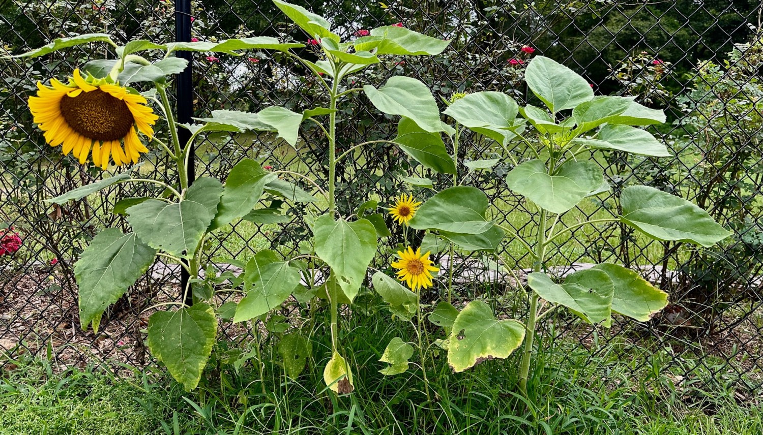 This is the first year we have planted sunflowers here at Three Geese Farm. Most of the 75 seeds I planted along the fence apparently became bird food, but a batch of about a half-dozen survived, with one bloom so large the stalk is bent over, like an old man whose spine has about given out.