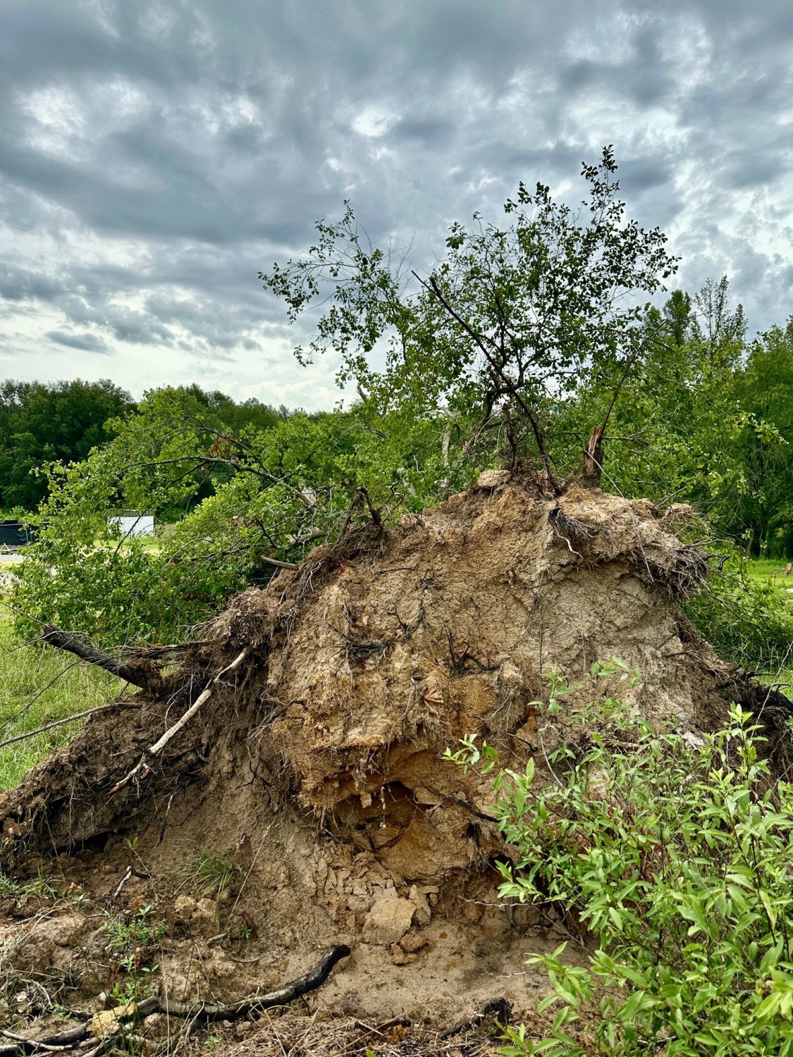 The view outside my window has changed in the past few weeks. The late June storm that streaked through with 90 mph winds uprooted an oak tree just outside the backyard fence. The tree stood at the crest of the hill that leads down to Pancho’s Pond. Now, when I look out the window, the view is dominated by its root ball instead of the pond. Birds continue to flitter about its still-green branches. We are waiting on our tree guy to get caught up with folks who had trees land on their houses and buildings to come take this tree away, as well as a Bradford pear that split in the front pasture.