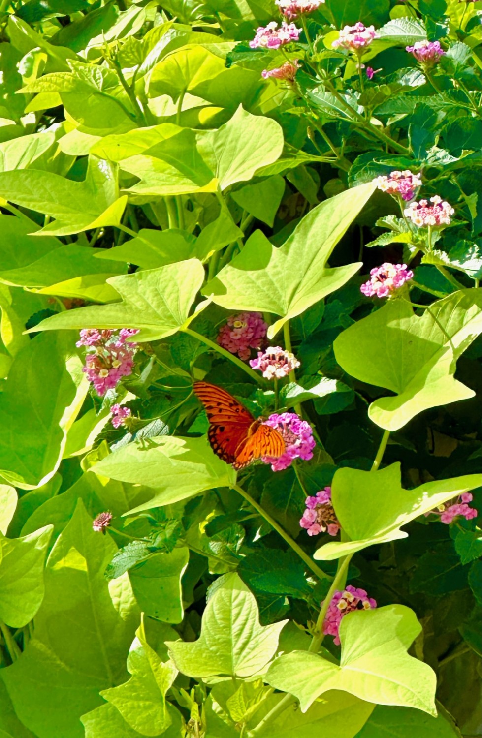 As I write this, once again ensconced in air conditioning and looking out at our refurbished backyard filled with heat-tolerant flowers, I see butterflies flitting about. I regularly water the fenced yard, so the contrast of its green Bermudagrass with the straw-yellow Bahia on the other side of the fence is striking. The butterflies and bees love the flowers, as do the hummingbirds sipping from the feeder or the blossoms.