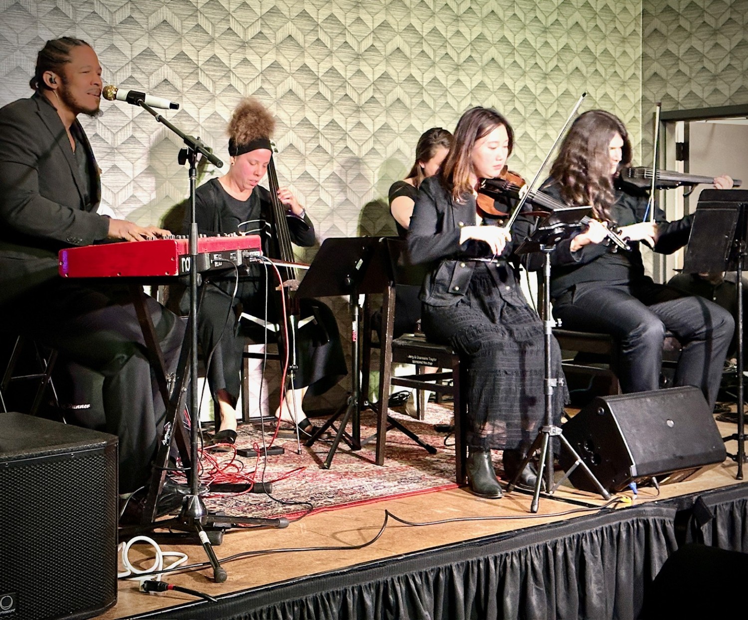Moore put on a compelling show, alternating between an electronic keyboard and electric guitar, backed up by that string quarter. The former running back at UNT learned his craft while at that university. His performance earned enthusiastic applause from the crowd, many of whom seem to know each other.