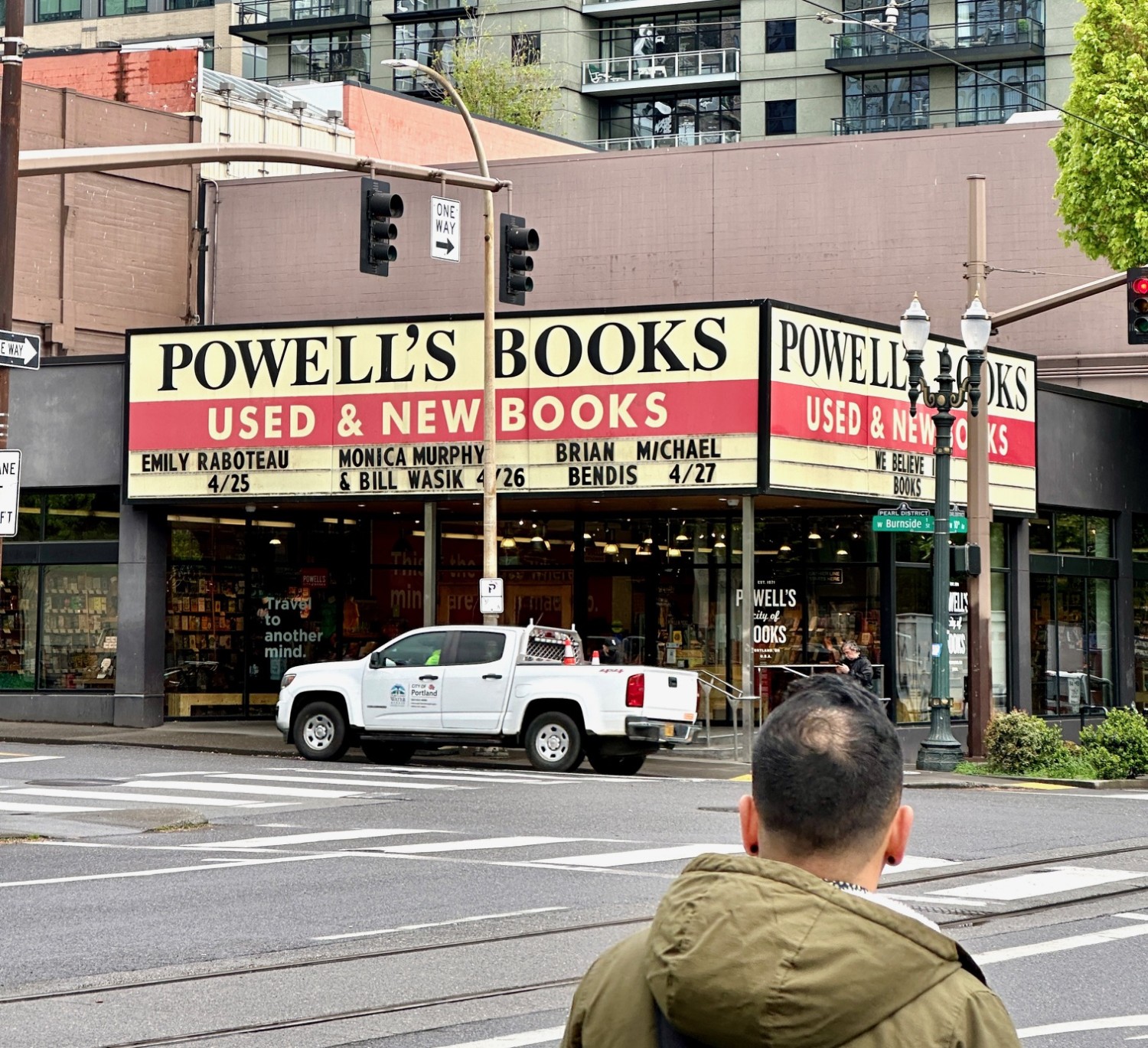 We could largely walk anywhere we wished to go from the Hotel Lucia, with the first stop being Powell’s Books. The world’s largest bookstore is a must-stop. On this Friday morning, the store is fairly quiet. My BMC and I visited the coffee shop to get fortified with lattes and breakfast fare before tackling the stacks. Aware that our luggage was already over the weight limit, we each limited ourselves to two books apiece. Such restraint is not easy when visiting such an amazing store.