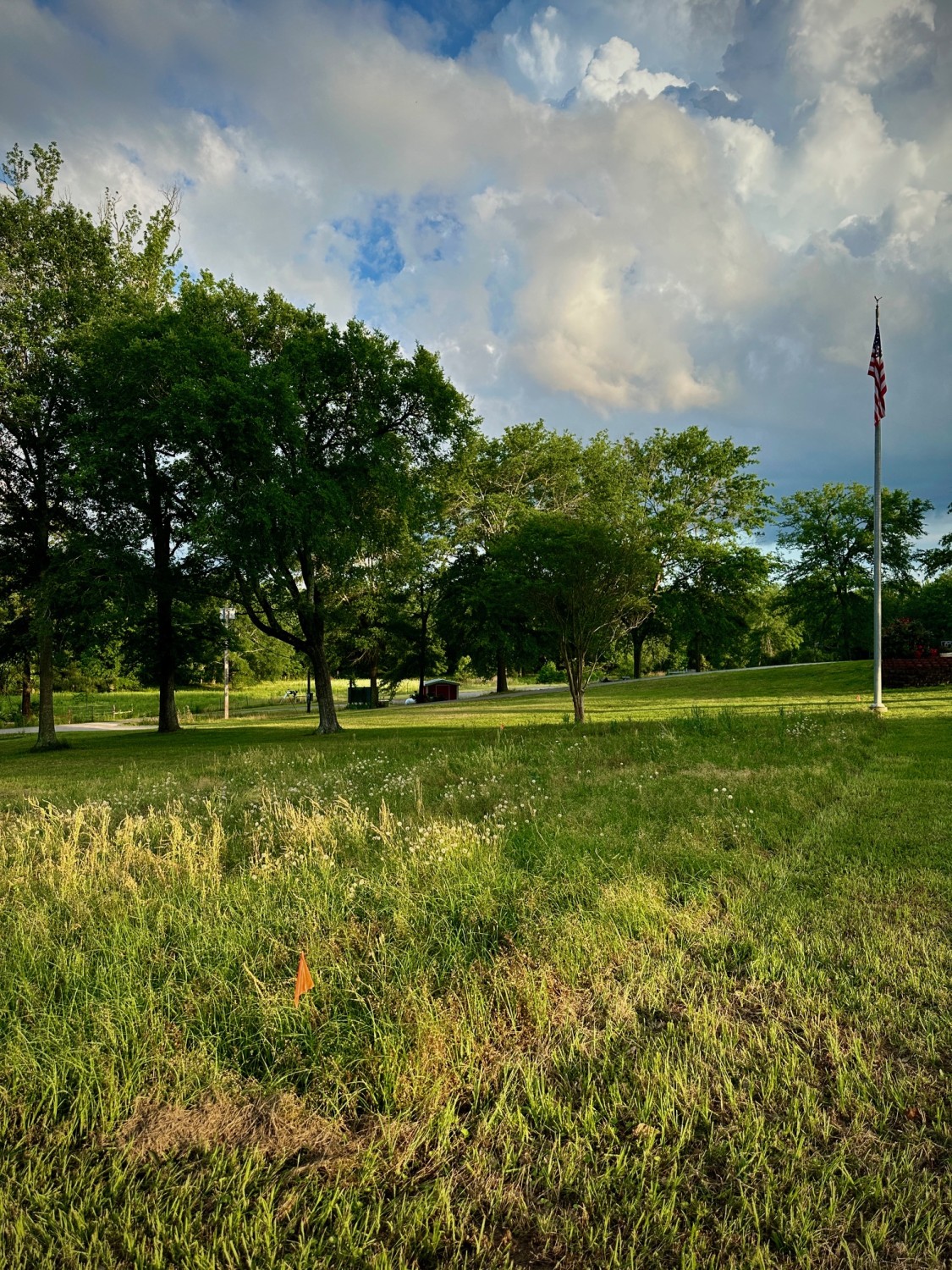Thus, on May 3, after getting off work at the library, I commenced to mowing the roughly 3 acres of untouched Bahia grass in front. I had marked off with utility line flags a rectangle about 40 x 50 feet that remains untouched, just in front of the flagpole. That is where I planted $150 worth of wildflower seed last fall, the fruits of which are slowly popping up. I will leave this plot untouched until the heat has burned up this rather expensive piece of pasture. The rest of the lan