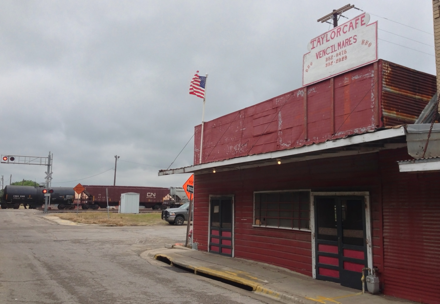 “Hard to see in there when it’s cloudy like this,” he says, and goes back to studying the back of his eyelids. I wander through, using my cell phone’s flashlight app feature, and tell him I’ll be back after lunch to look at a couple of chairs with a $10 price tag. It’s time to meet my acquaintance at the Taylor Cafe. It’s in a largely sheet-metal building painted red, down on Main Street under the overpass and hard by the railroad tracks. Vencil Mares opened this barbecue joint in 1946. He will turn 90 this year and is still at work, though I didn’t see him on this day.