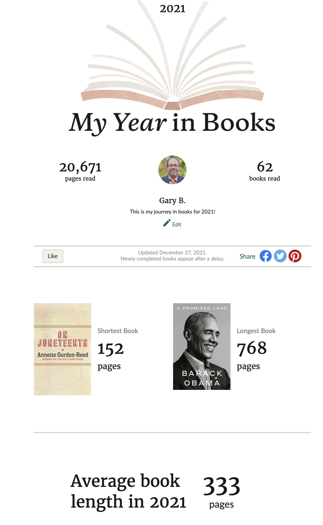 Goodreads announced at year end, I had completed 62 books for a total of 20,671 pages. The previous year, I read 56 books and about the same number of pages. I guess I read some longer books in 2020. The longest book I read last year, weighing in at 768 pages, was A Promised Land, by former President Barack Obama, the first installment of his memoirs. Obama is an exceptional writer, self-deprecating and funny, able to cast a reflective eye on his presidency. Very few politicians can do that, or even try.