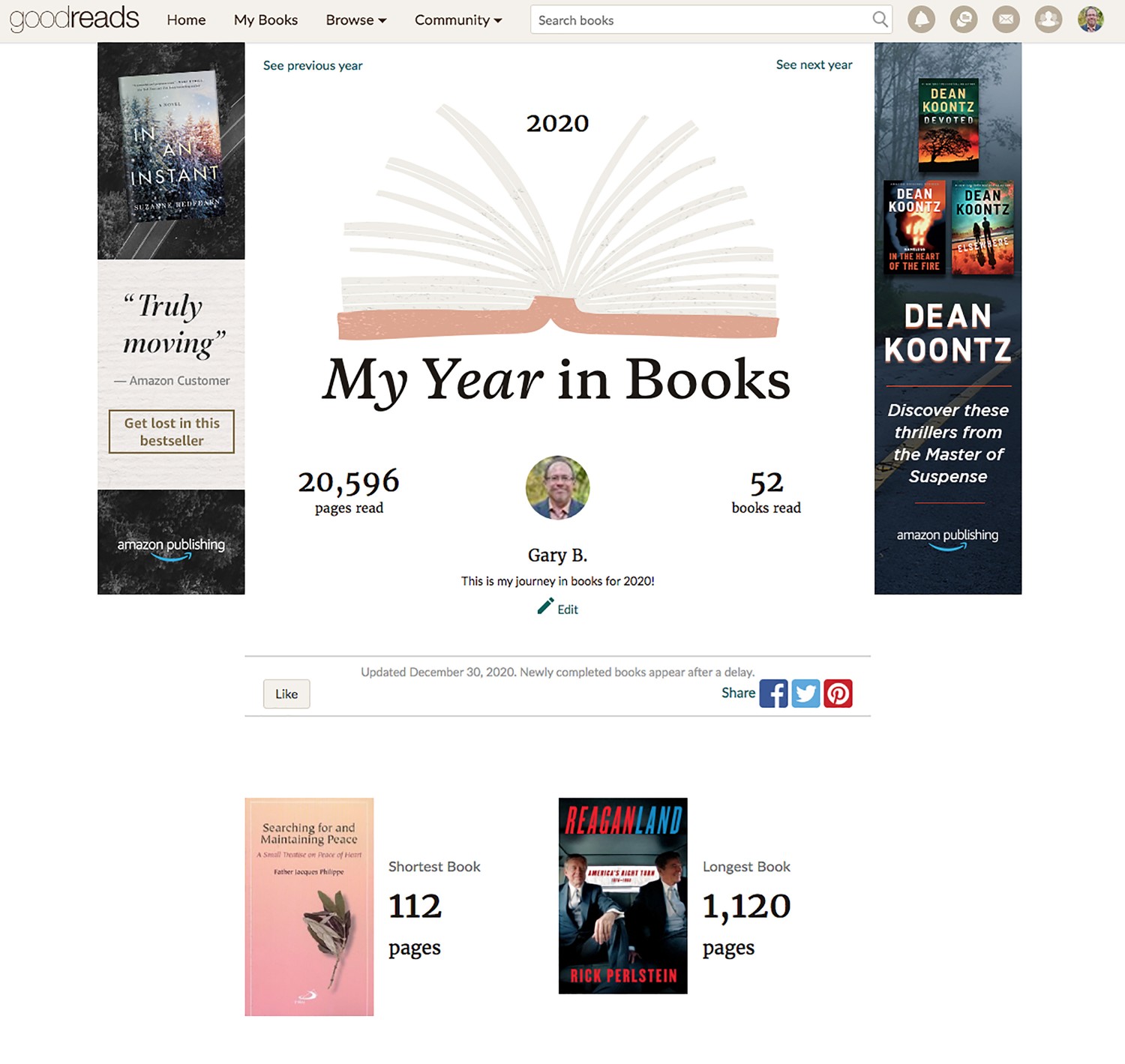 A couple of years ago, Mere, my middle daughter, gave me a ballcap that I wear often while reading outside in the gazebo. The inscription: Fight Evil. Read Books. It is one of my favorite caps. She also told me about the Goodreads app, which I now use to keep up with books I have read or plan to read. For years, I used to keep a handwritten list in a notebook. That was rather analog. Goodreads is way handier and likely will keep me from buying the same novel twice, a few years apart. I have done that more than once. Now that 2020 is in hindsight, Goodreads kindly provided My Year in Books. So here are the highlights and some of the books I consumed while holed up at home last year.