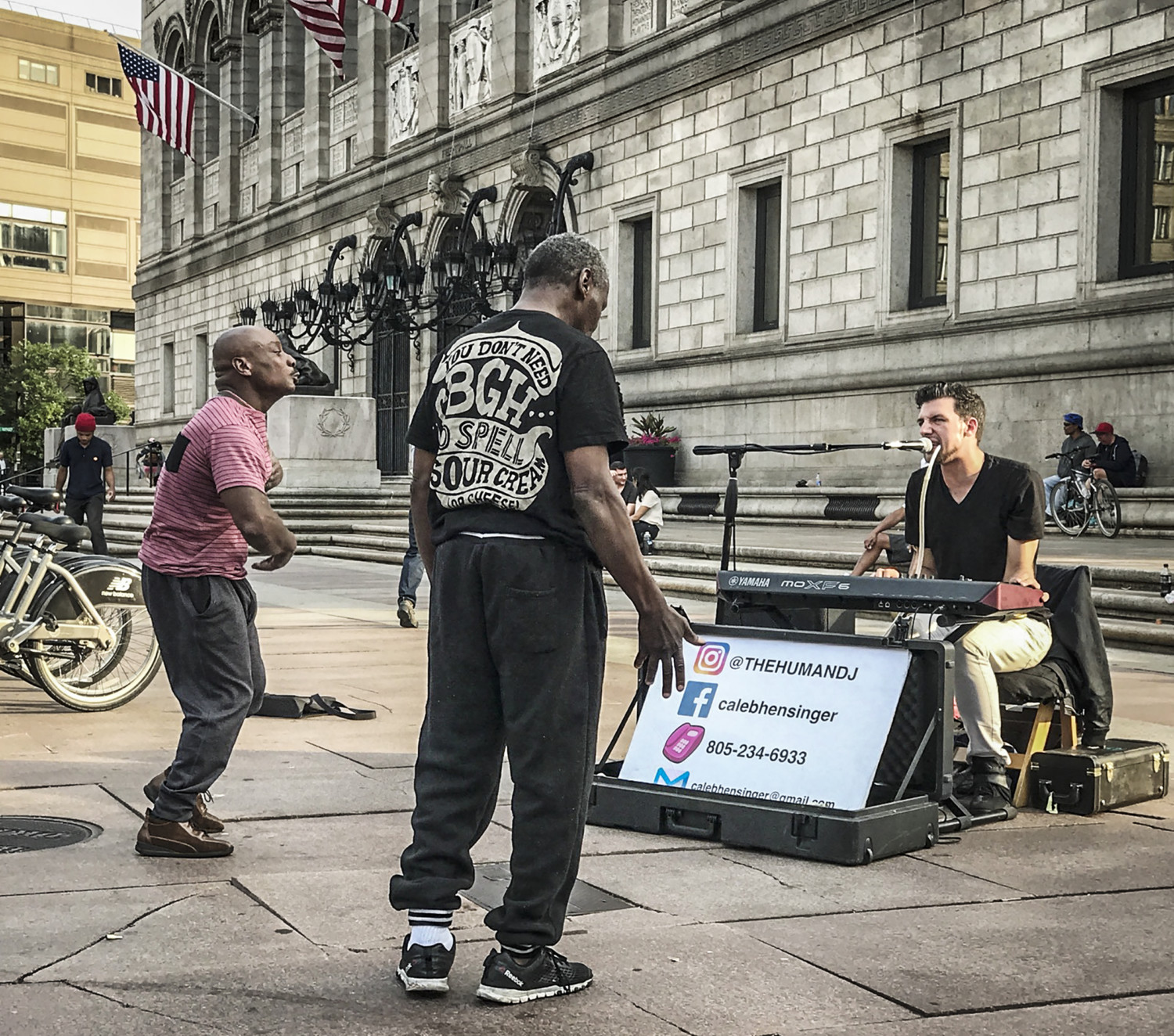 ted, the sidewalks again filled with folks, a few dozen gathered around at Copley Square, next to Boston Public Library, as the sun was setting over the Charles River. A musician named Caleb Hunsinger, former student at the nearby acclaimed Berklee College of Music, was playing an electronic keyboard, trumpet and voice distorter, riffing on Stevie Wonder songs. He was a highly talented busker, his trumpet case filled with currency. A couple of street folks were dancing too close inside Caleb’s personal space, and he kept politely waving them back. A pleasant breeze continued to waft down Boylston as we headed back to the hotel, grateful that another week of pristine weather was in our future.