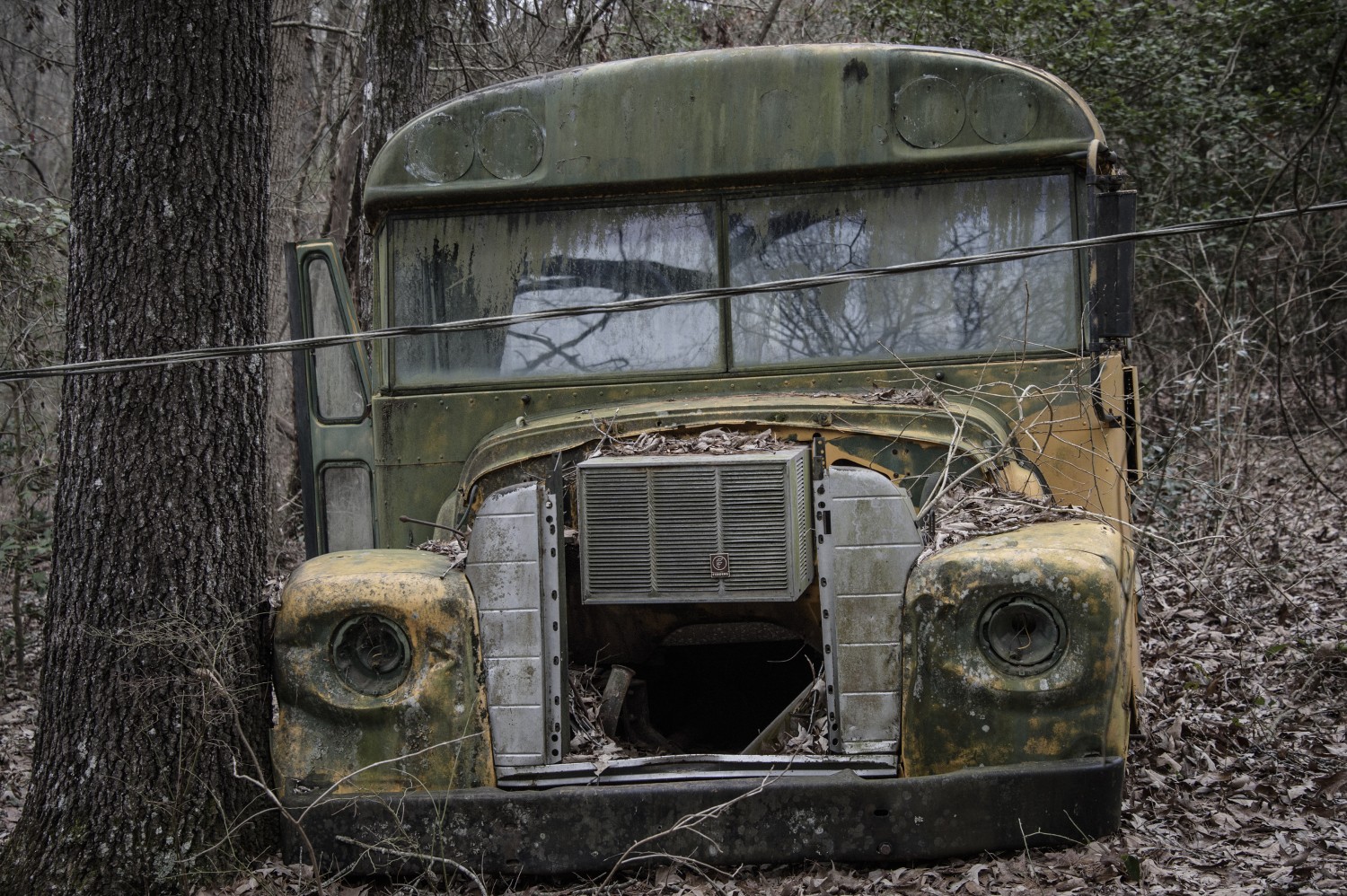 Before he bought the trailer, the family camped out on weekends and in the summer in an old school bus that once belonged to the Jefferson school district. It is in a cleared area down the road from the trailer. All the seats were pulled out, and an air-conditioner installed where the engine used to be. Most of the bus was painted green, but the far side was still yellow. My Beautiful Mystery Companion said they ran out of paint.