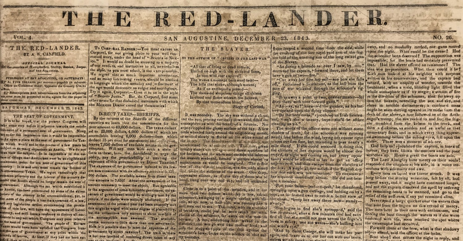 The prominent editor of the Red-Lander, for seven of its nine years in existence, was Alanson Wyllys Canfield, who emigrated to Texas from his native Connecticut in 1835, the year before the Texas revolution, in which he fought. He was 27 at the time and took over publishing what became The Red-Lander in 1839 at the age of 31. Part of my fascination with Canfield is that I took over running a weekly newspaper in San Augustine at the age of 26 – 40 years ago this July. That paper was called The Rambler. Eventually I became the owner and stayed there for five years. That experience provided the foundation on which I built a career running newspapers for several decades.