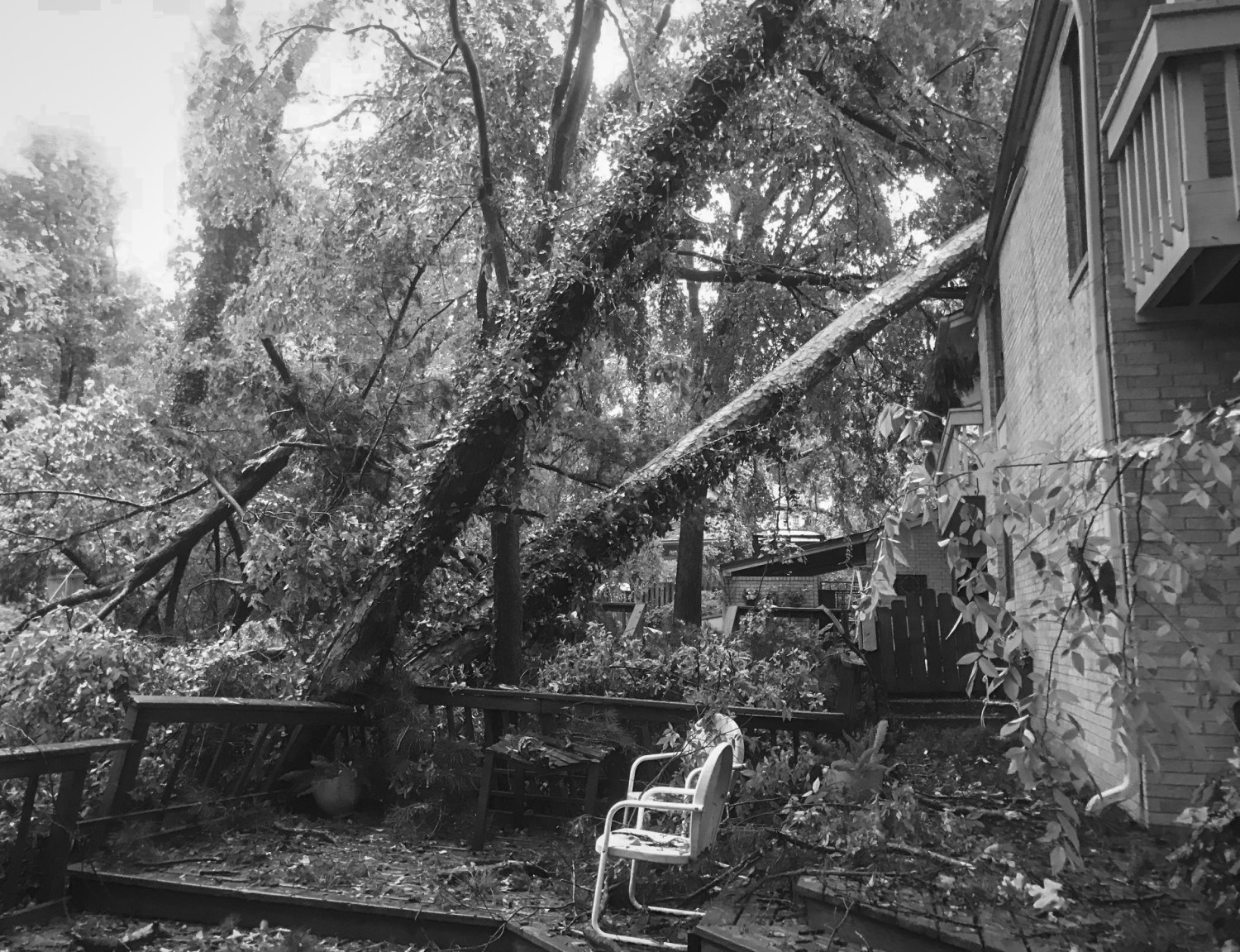 We quickly left campus and threaded our way home. Power was out everywhere headed north, so every intersection was a four-way stop. It was slow going. Rescue crews were a constant sight, working a number of wrecks. But none of what we saw, or the photos that Abbie sent, prepared us for what had happened to our neighborhood — and to our home. Trees toppled into roofs, or the tops sheared off. Debris was everywhere, power lines strewn across streets. Making our way in separate vehicles to our house was laborious.