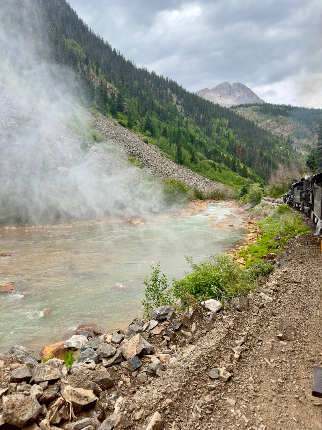 The Animas River flows nearby for just about the entire trip, its emerald-green water rushing over rocks. Occasionally we see someone casting a line into the water. Invariably they wave as well. At times the river is 400 feet below the tracks, at others nearly level with us. We take turns leaning cautiously out the window to take photographs, keeping a tight grip on our phones. The conductor has told us the train would stop if someone did drop a phone, but I do not want to be that guy. I have already been responsible for a commercial airliner having to make an emergency stop to let me off. But that is another story.