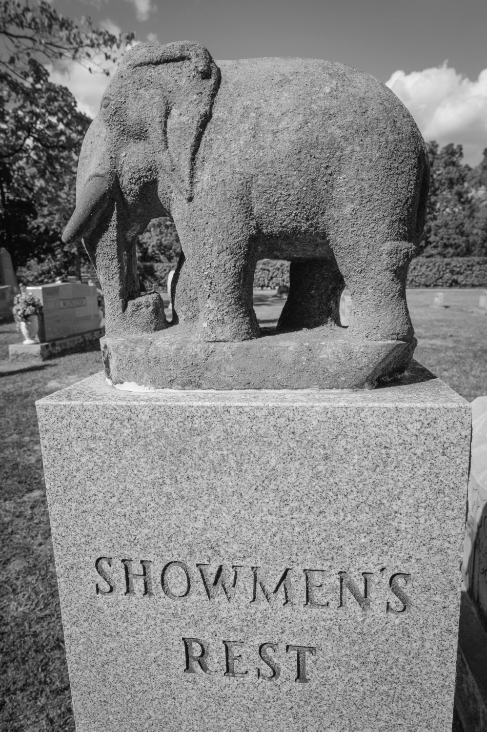 Showmen’s Rest is set off from the rest of the cemetery by granite posts with a statue of an elephant on each. Mature trees cast shade and respite from the Indian summer. I was the only visitor on this afternoon.