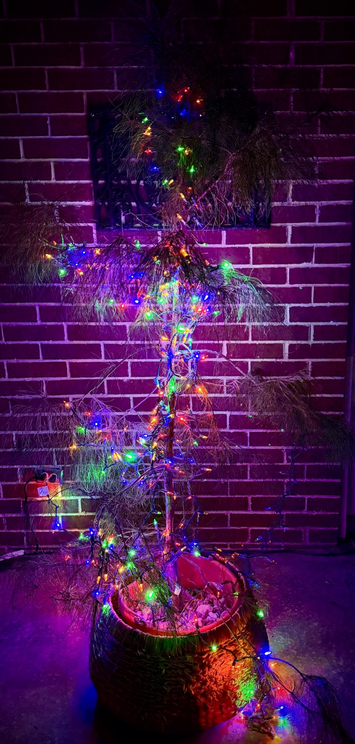 k, brought up an empty one. My BMC held the tree upright in the feed bucket, which was nestled in a large wicker basket. I poured the rock into that bucket to create a sturdy tree stand. Daughter Abbie hung 300 feet of lights on the tree, its thin branches groaning under the weight.