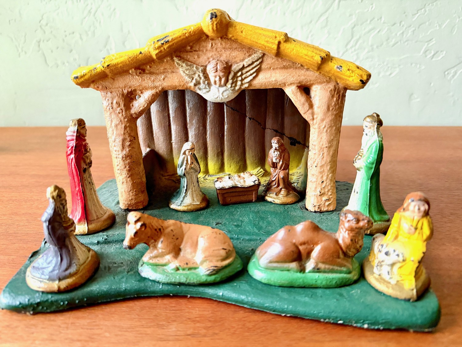 My favorite Christmas decoration is a ceramic crèche that belonged to my parents. It is at least 60 years old, some of the figures chipped in places. There is a hole in the roof in which a Christmas bulb can be inserted, which my mother always did. I prefer to leave it unlighted, reasoning the actual manger didn’t have electricity. The entire crèche is only 10 inches wide. Baby Jesus is about the size of a pecan. Usually, it sits in my study where I can admire it and remember the many Christmases spent with family and children. With Ozzie the Terrorist kitty lurking about, it is hidden in the main bedroom, behind closed doors.