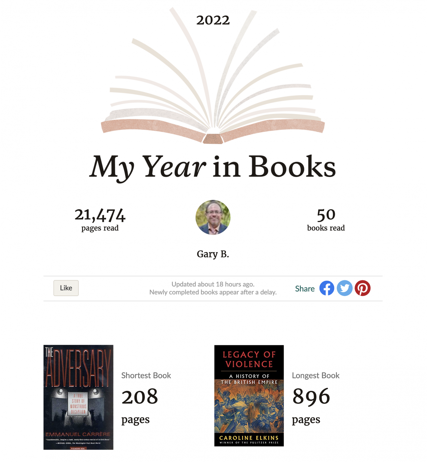 According to Goodreads, the app I use to keep track, I read 50 books totaling 21,474 pages last year. That is down a dozen books from 2021, though the total page count was up almost 1,000. Fewer books with more pages, obviously.