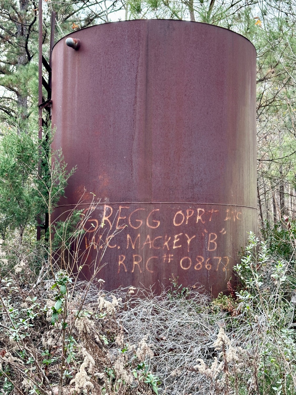 About 50 feet away was a large rusty tank about 15-feet high. Years ago, someone had spraypainted Gregg Oprt Inc, W.C. Mackey “B,” RRC# 08672. Our farm once was home to about a dozen oil rigs dating back to the 1930s, according to what one fellow told me. All that is left are the four concrete pillars on which the derricks were anchored. A few times, as I slowly work to tame this property, I have bashed into one of these pillars with the bushhog, since they are hidden in the weeds. That will jar you right out of the tractor seat.