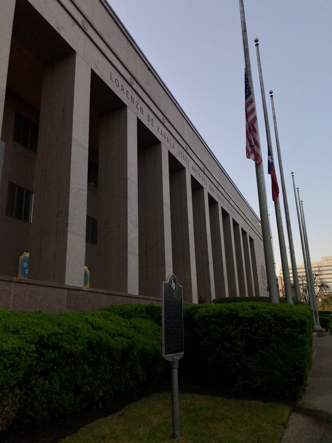 The next morning, I returned to one of my favorite haunts, the Texas State Library and Archives building, across the street from the Capitol, whose lawn was dotted with happy children romping in the grass on a sunny day. The library was open by appointment only, made well in advance. Masks were required, and I dutifully wore mine for three hours while taking cellphone photographs of print copies of the San Augustine Red-Lander. The newspapers, in bound volumes, are in remarkably good condition for being 180 years old — published in 1841. I was the only person in the archives room, with a masked librarian seated behind a plexiglass shield a dozen feet away. In my three-hour allotted time, I was only able to get through about half the bound copies, so I will be back within a month or so.