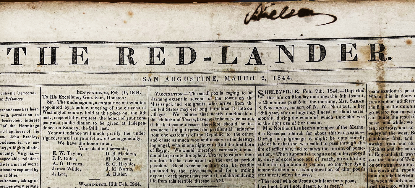 AUSTIN — I am taking another deep dive into the 1840s, inside the Lorenzo de Zavala State Archives and Library, a handsome structure located on the east side of the Capitol grounds. I was last here in late March, perusing through printed copies of the San Augustine Red-Lander for a book project. I had planned to return much sooner, but life intervened — selling one house, buying another, tackling the task of taming 57 acres of mainly timber but still with plenty to mow.