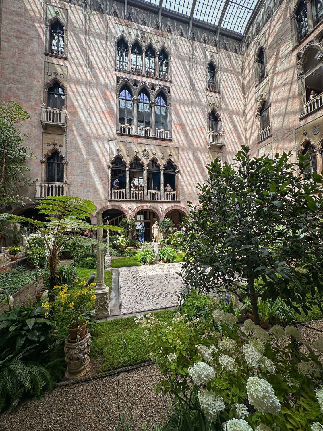 The museum is stunning, reflecting the tastes and love for beauty that Isabella cultivated throughout her life. The courtyard is the focal point, riotous with color in summer, when flowers in New England reach their peak. My BMC immediately announced her willingness to simply live in the courtyard — at least until winter arrived. Alas, it was roped off, so we had to settle for taking photographs by leaning out the arched windows.