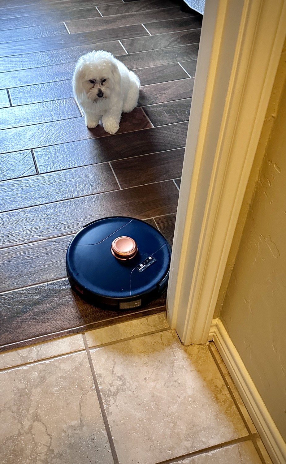 Bob’s first foray through our house was an experimental journey, meant to figure out which chair legs blocked his way, or to note a lamp cord could cause entanglement. As expected — indeed, giddily anticipated — Bob terrorized our four critters, who did not appreciate this interloper on their fiefdom. At one point, Mollie the Maltese, Tater the Blubba Nugget cat, and Gatsby the Cavapoo were all perched on the bed in the spare bedroom, watching with alarm as Bob worked beneath them. Olive the Invisible Kitty was, well, nowhere to be found, as usual.