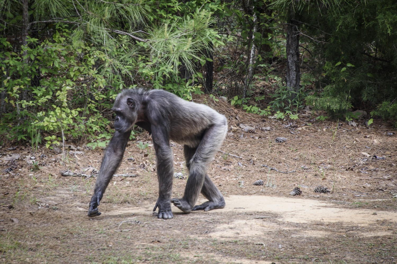 So, what to do with all those chimps? Chimp Haven, founded in 1995, received a federal contract after Congress passed the CHIMP Act (Chimpanzee Health Improvement Maintenance) in 2000. Caddo Parish, where Keithville is located, donated 200 acres of heavily forested land inside the nature park. Chimp Haven set about creating a sanctuary where the chimps live in large social groups, an average of a dozen or so to each habitat, which are separated by tall fences with mesh at the bottom and either wood or concrete at top, so the chimps can’t climb over. The chimps can safely build nests in trees if they wish which allows them to live safely in a natural environment. The chimps can sleep inside or outside, as they choose. They are lovingly cared for by a 70-employee staff that includes veterinarians and other trained support staff. Since the goal is to acquire as many research lab chimps as possible – all but 50 have been retired by the National Institutes of Health, the chimps are sterilized to prevent births that would require more care, though a handful of “accidents” have happened. No chimps are ever returned to laboratories. Besides federal funding, Chimp Haven actively seeks outside donations. It costs about $17,000 annually to care for each chimp, according to its website.