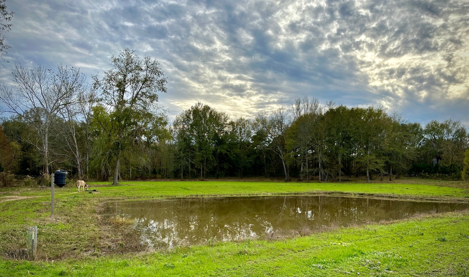 Basically, this is a circular saw blade on the end of the weed whacker. It will cut through brush and saplings. I always wear heavy boots when using it and keep an eye on where my feet are located. In about two hours, I had cut down all the vegetation, most of it at least four feet high, that circled the edge of Pancho’s Pond and hauled it with the tractor to the burn pile. With the ryegrass coming on nicely, that area now looks like a park.