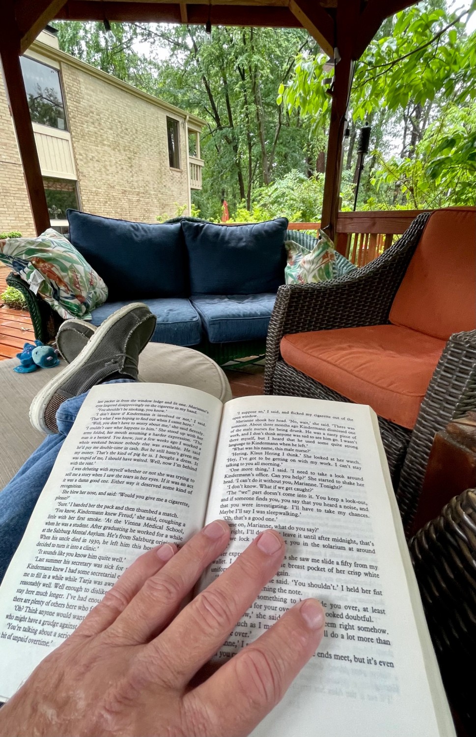 • This is not a complete list of small things that provide joy, but I’ll end with taking pleasure in reading in our gazebo while a gentle rain is falling, the wireless speaker playing NPR, a ceiling fan stirring the breeze, a cat curled up at my feet. It is a peaceful, easy feeling, as the song goes. And lately, it rains every afternoon, not that I’m complaining.