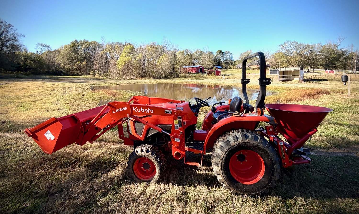 • Our shiny new orange tractor’s fuel tank fills from the top of the engine cover. The tank on the older tractor it replaced was behind the seat, meaning I could stand on the bushhog at the rear and leverage a five-gallon can of diesel up against my leg to pour it into the tank.
