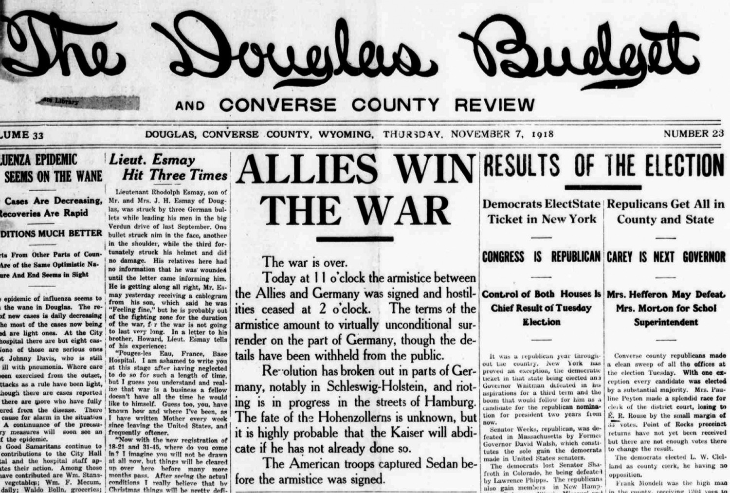 - Finally, in the Nov. 14, 2018 issue, The Budget with eight decks of headline announced that DEMOCRACY TRIUMPHS IN GREATEST WORLD WAR. The Kaiser had abdicated and, as the story reported, “It is ended — officially ended.” Less than 20 years later, Hitler would rise to power. But that’s another story.