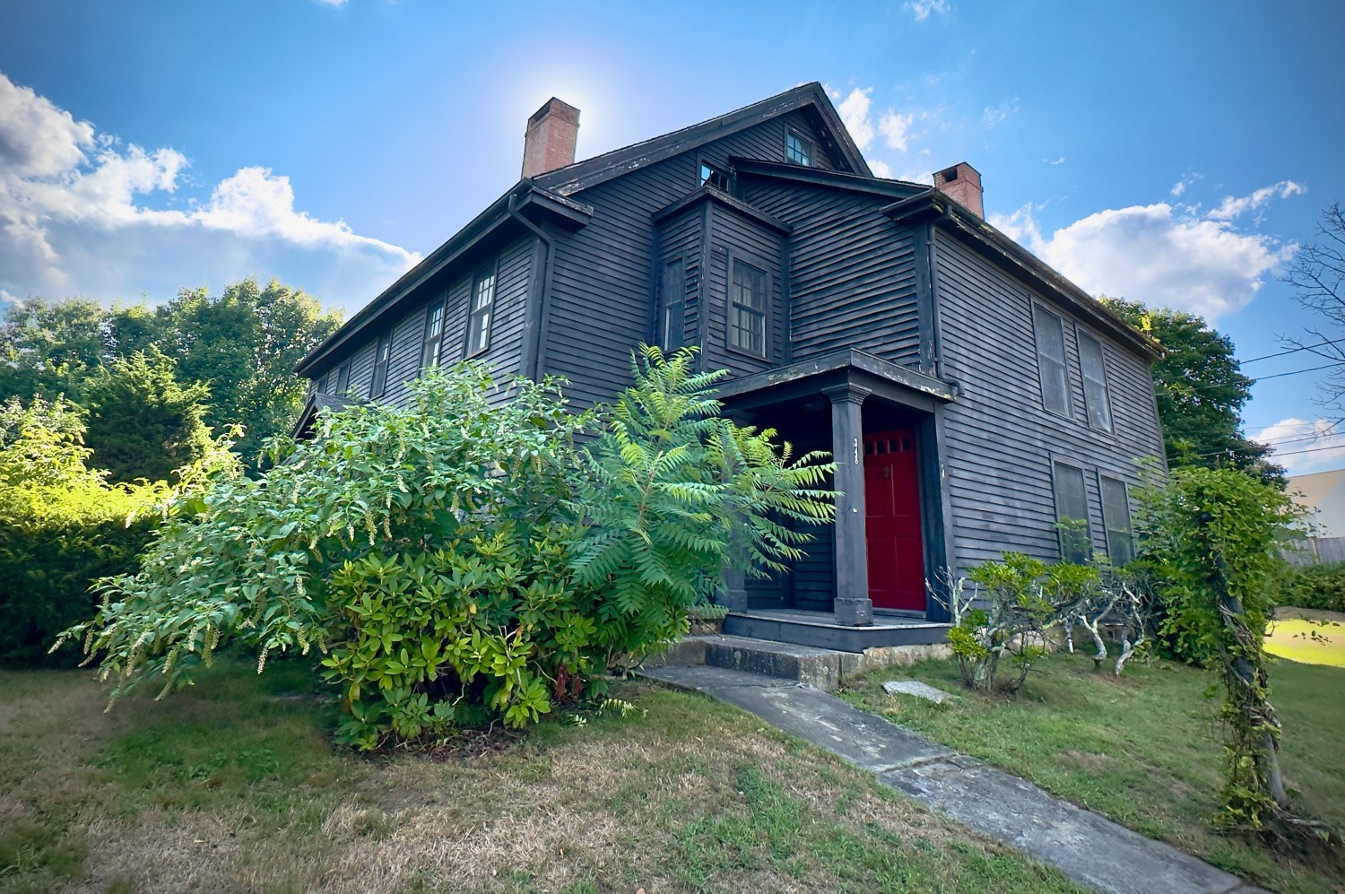 My BMC and I greatly enjoy this show, which for part of one season featured work that Knight and his coworkers did on the John Proctor house. We drove up to the house, which is just a few dozen feet off a busy highway at a sharp curve. I got out of the rental, walked up to the house, careful not to trespass on private property, and took photos. Like many old houses in Salem, the Proctor House is painted charcoal black — brighter hues not being easily available in the 17th century. The darker color is also heat-absorbent, important in frigid New England.