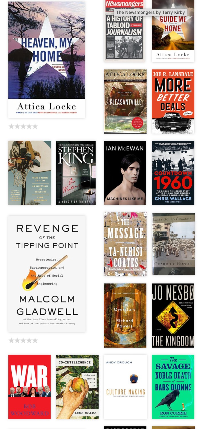 - The Overstory, by Richard Powers (502 pages). I “discovered” Richard Powers in 2025, to my considerable delight. The Overstory, published in 2018, won the Pulitzer Prize and justifiably so. Powers’ evocative description of the natural world and our place in it kept me up late flipping pages. Before the year was out, I had devoured four of his novels. The Overstory’s plot travels from New York before the Civil War to the 20th-century timber wars in the Pacific Northwest. It is a beautiful, transcendent novel.