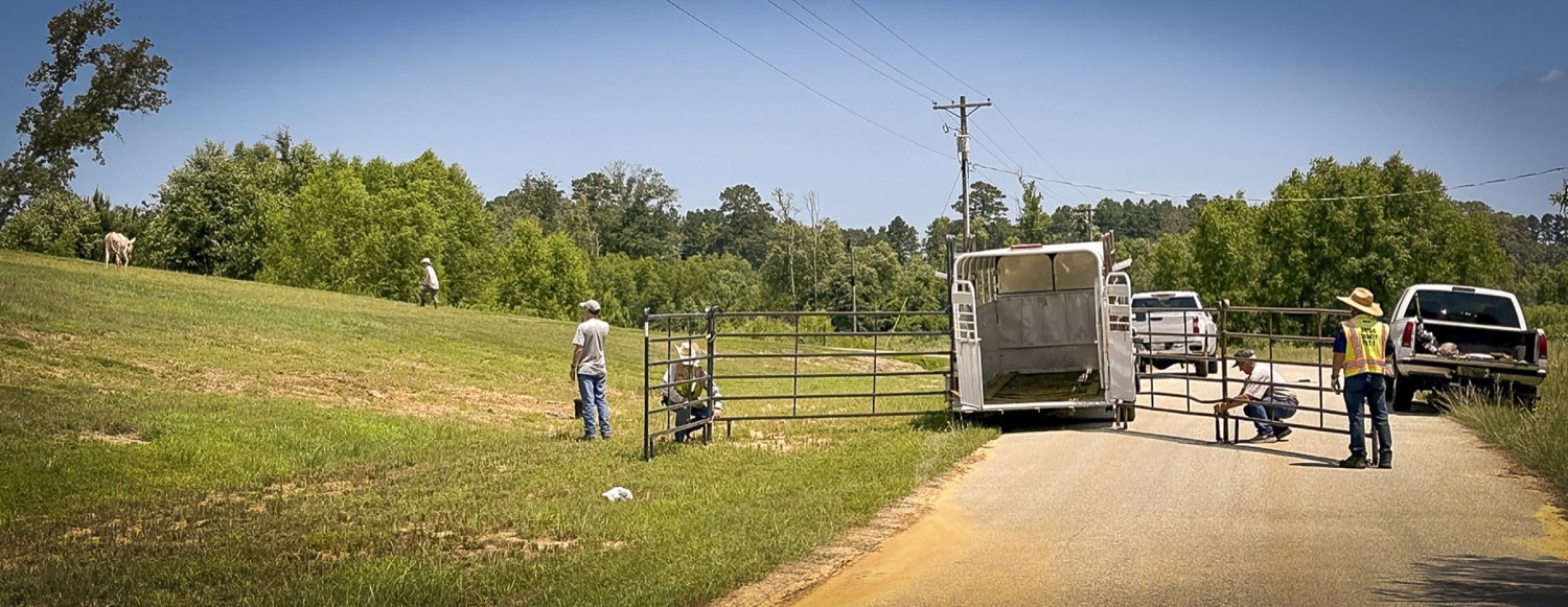 After about an hour’s standoff — joined by a couple of sheriff’s deputies, the neighbors in whose yard Pancho decided to graze, a buddy who came out to work on the fish feeder and willingly joined the crowd — a sheriff’s department cattle trailer rumbled down the lane, with two fellows inside the truck. They pulled livestock panels off each side of the trailer and set up a wide chute, about a dozen of us sweating profusely in the 95-degree heat.