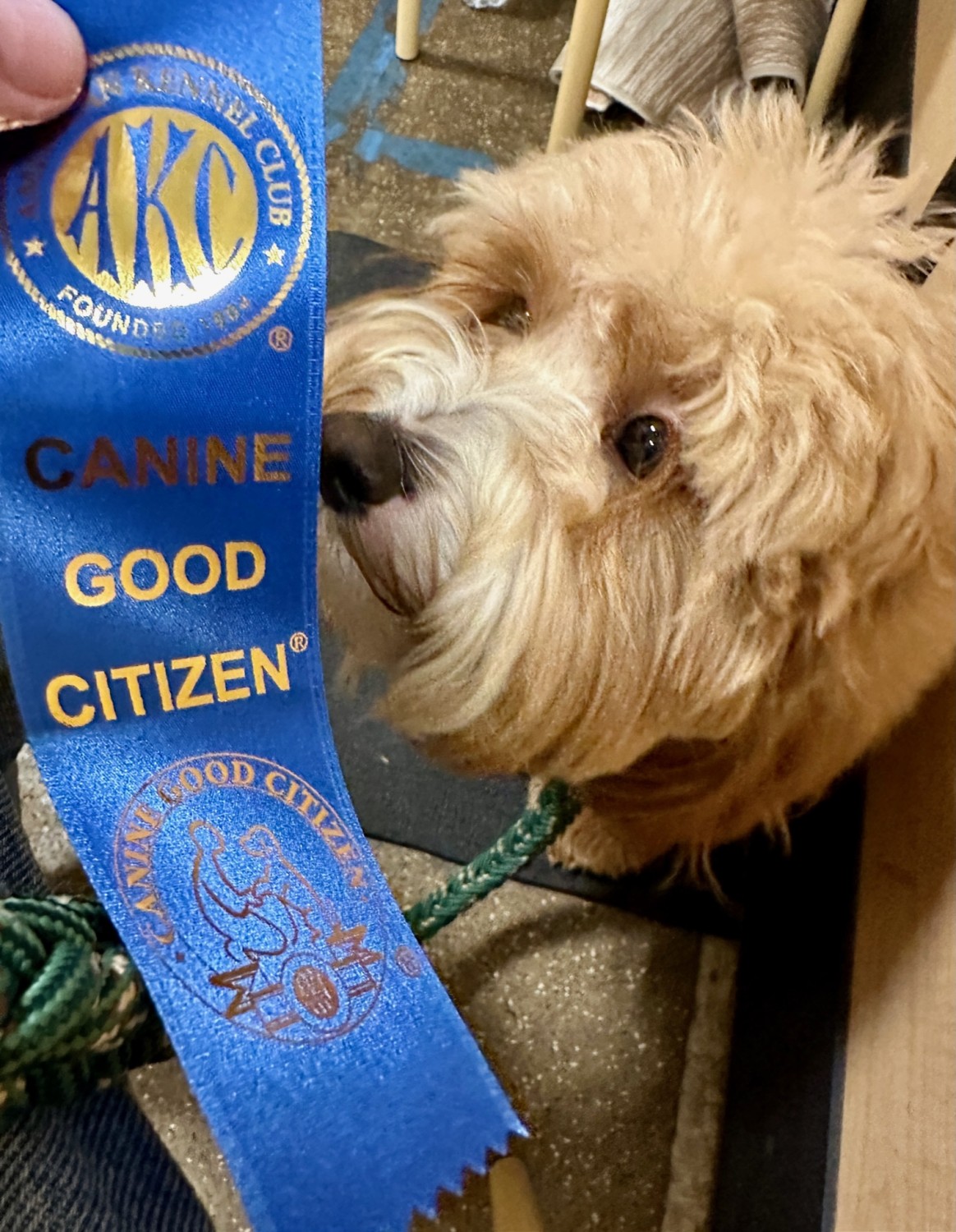 The rest of the test was a walk in the park, or rather PetSmart. We wove around the store displays, passing dogs and humans without incident. We returned to the training room, where Gatsby received his Canine Good Citizen ribbon, as shown in the photo. He was more interested in a treat now that they were allowed. I filed for his official certificate online. You can bet I am going to get that framed when it arrives.
