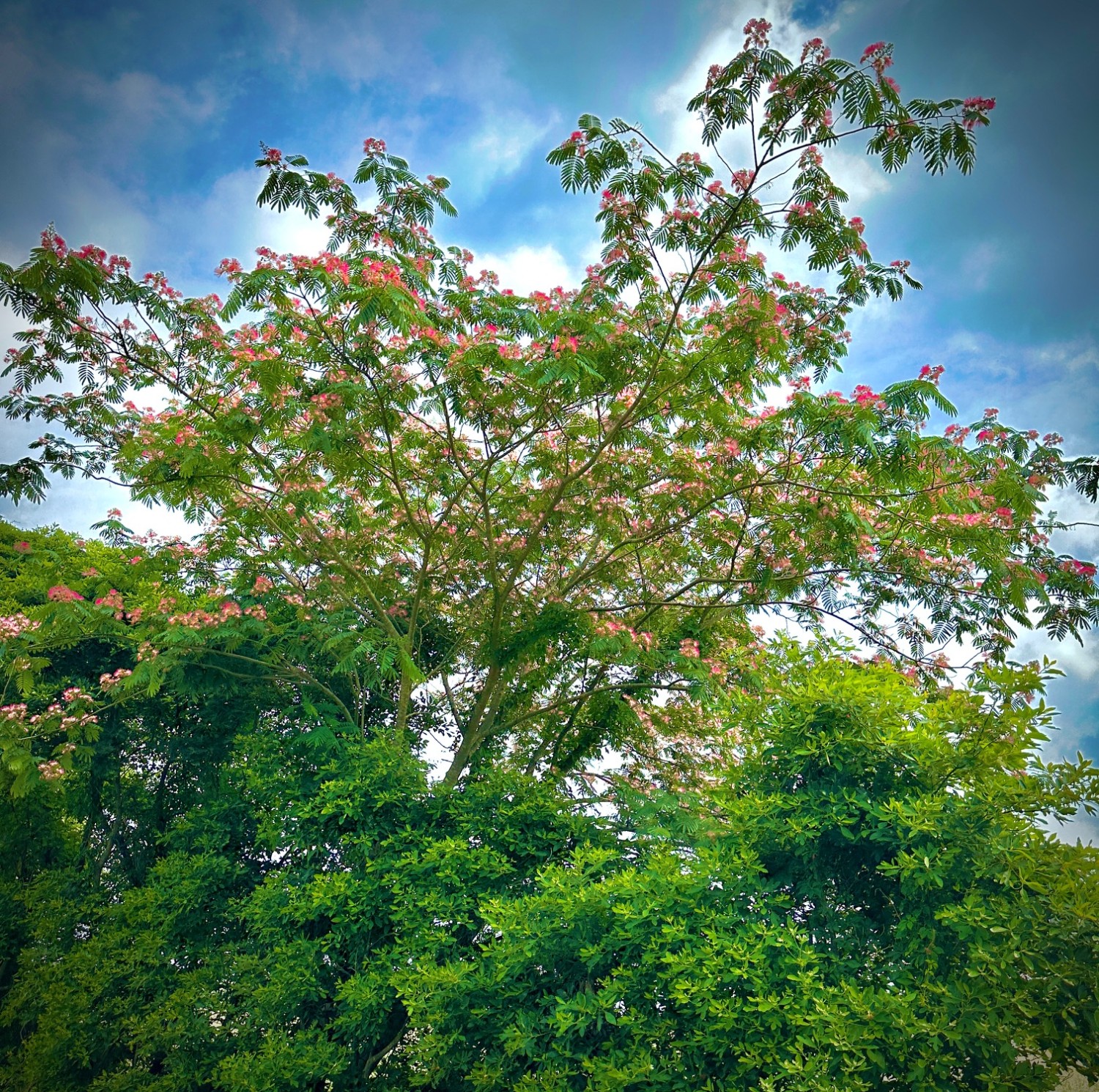 My love of mimosa trees began when we moved to Longview from New Hampshire in the summer of 1968. We first lived with newly widowed Grampa Borders in Greggton for a couple of months. His widower status did not last long. By year’s end, I witnessed his wedding to a lovely woman. It was held at First Baptist Church downtown. The uniqueness of attending my grandfather’s wedding was not lost on me, especially at 13.