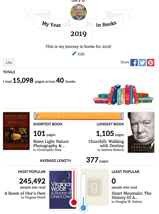 The shortest book read was Risen Light Nature Photography & Devotional, at 101 pages. I used some of its devotionals while teaching a photography class at the university last fall. Interestingly, the most popular book I read among the 90 million users worldwide on Goodreads was A Room of One’s Own, by Virginia Woolf, which was recommended by a non-Goodreads and actual physical friend. It’s a compilation of two essays Woolf wrote about the constraints women faced at the time — and still likely face — if they wished to become writers: time, space, the traditional duties expected of females during the early decades of the 20th century.