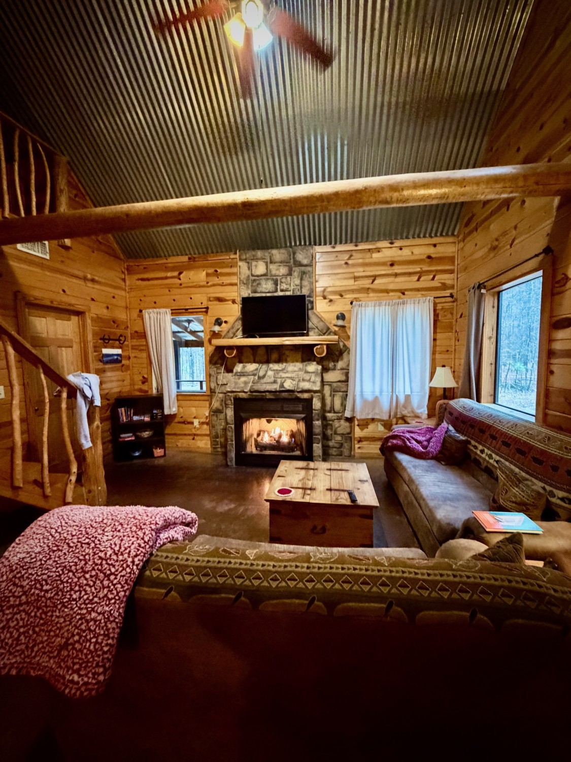Finally, the skies opened in earnest. There would be no hiking on this day. We headed back to the cabin to read by the gas-log fire, the door open so we could hear the patter of rain.
