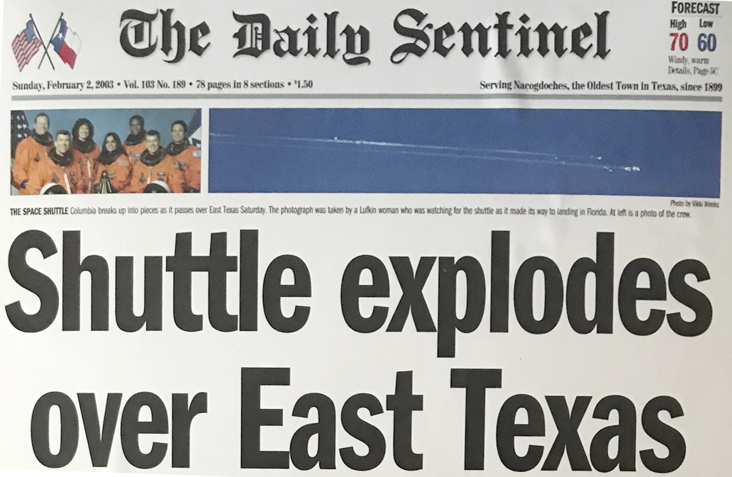 As I have written before, minutes later, pieces of the shuttle began raining down over Nacogdoches and much of Deep East Texas. I rushed to work at the newspaper and began frantically calling my staff. It was quickly clear that our small crew would be covering the biggest story of their careers. Within a few hours, our town filled with satellite trucks and journalists, National Guardsmen, sightseers, and hundreds of volunteer recovery workers. That scene was repeated in other towns throughout the Piney Woods — Lufkin