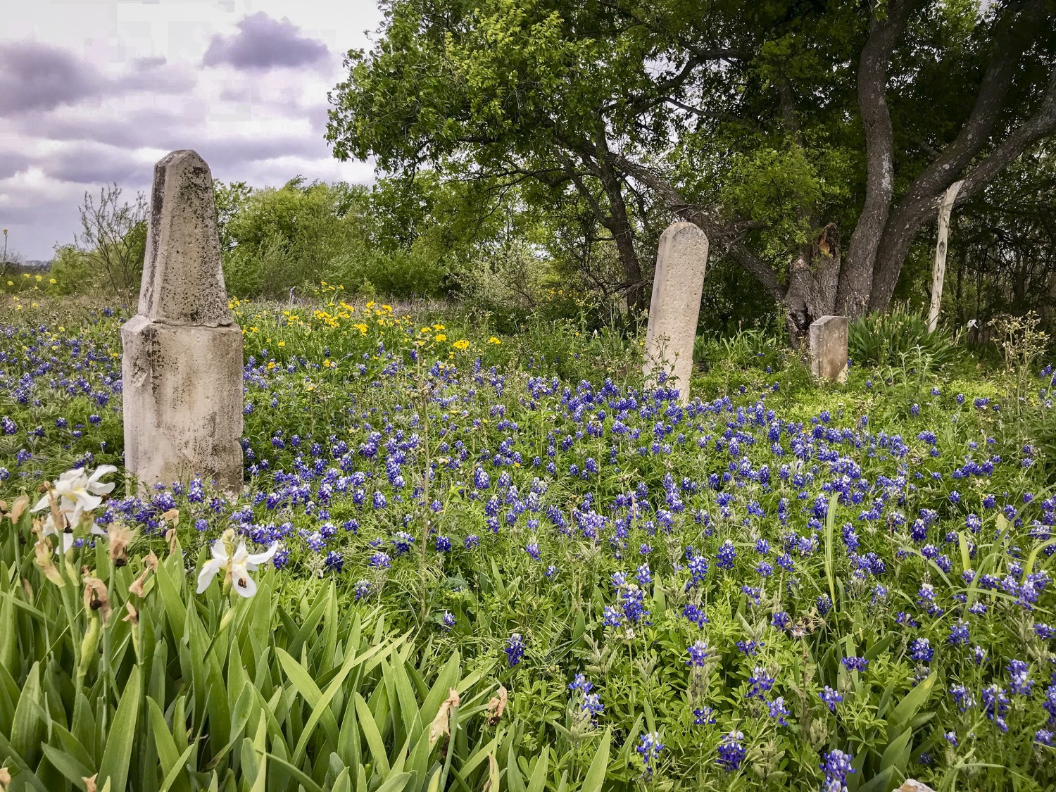 After leaving the Fox homeplace, on which his adult children still live, I stopped at an old cemetery I had never noticed before, on the side of the road. Usually the Johnson grass overwhelms the tombstones but someone had mowed some of the grass, leaving the bluebonnets, lilies and those yellow wildflowers whose name I don’t know. I stopped and took some photos. The gravestones, perhaps a dozen, dated back to the 1870s.