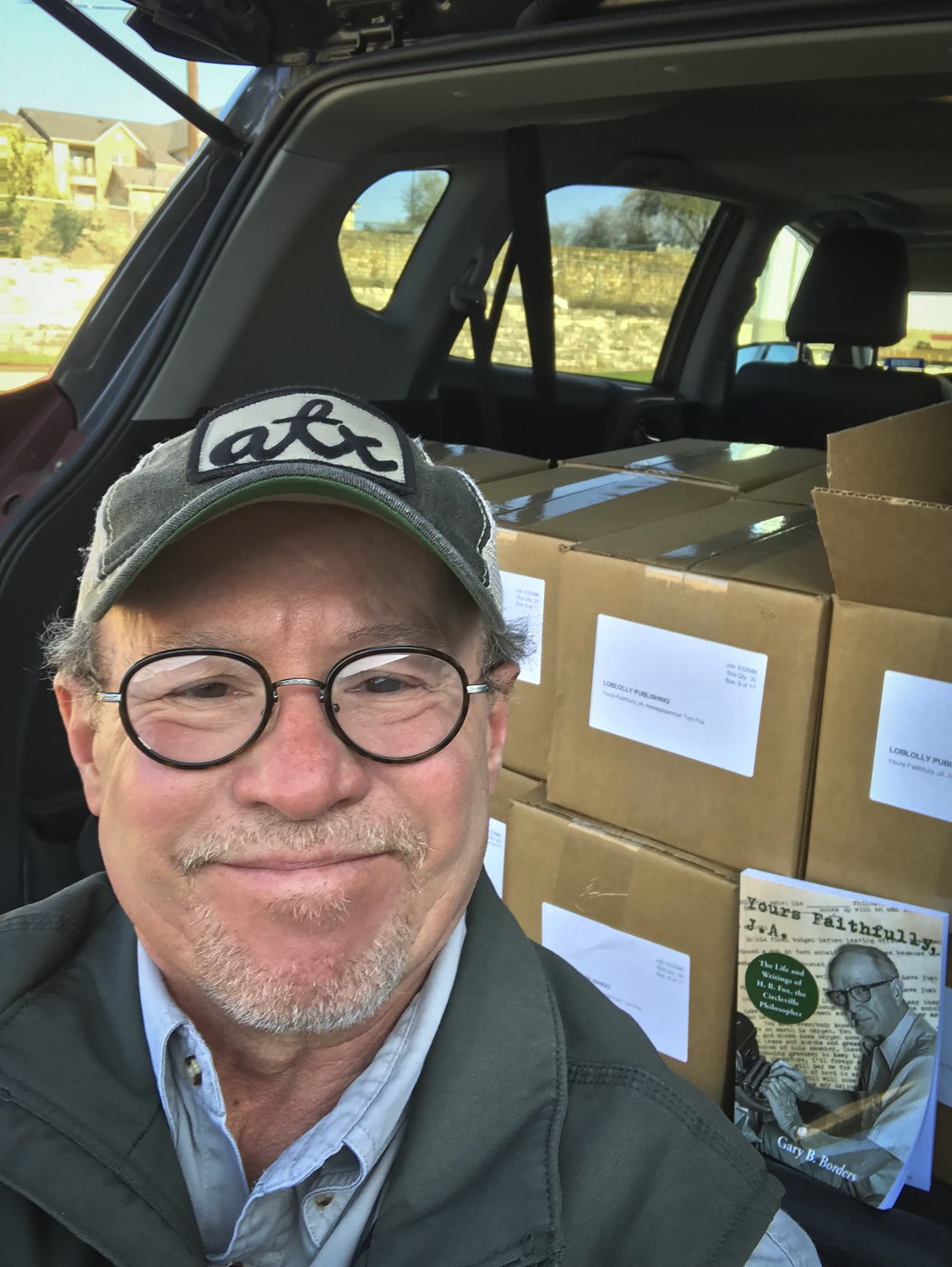I drove there, quickly found the “Customer Pickup” sign and watched as a friendly fellow loaded up 17 boxes of my biography of H.B. Fox, which finally was coming into print. I sliced open a box and pulled out a copy. New books have a lovely smell, a promise of pleasant hours spent together. At least, that’s what I hope folks who buy my book will conclude. Then I drove a few hundred feet down the parking lot, which was empty except for me and those box trailers, opened the lid of my little SUV and…