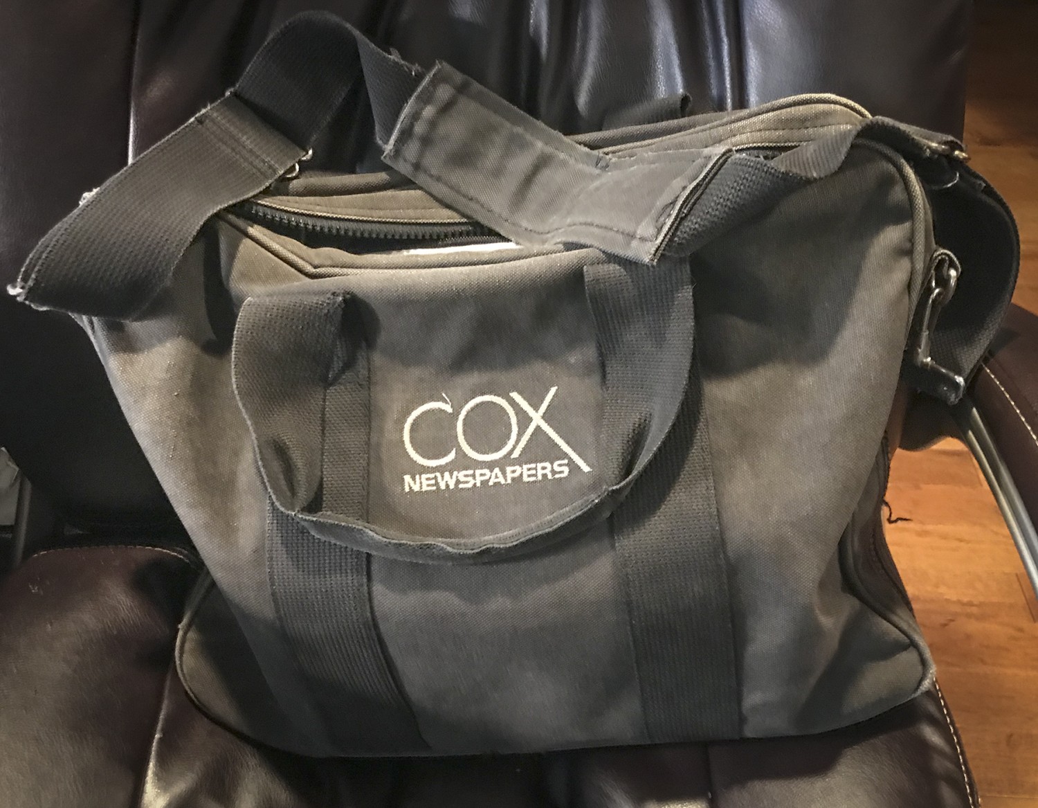Yorker and whatever else I needed. I was given the bag at a meeting of Cox editors in the early 1990s. It was sturdy, weathered well and embroidered with “Cox Newspapers” on the front. I had to have the strap repaired a few years ago, and the fellow stitched it up with brown thread for some reason. The bag and strap were once black, now faded to gray. I know how it feels, fading to gray.