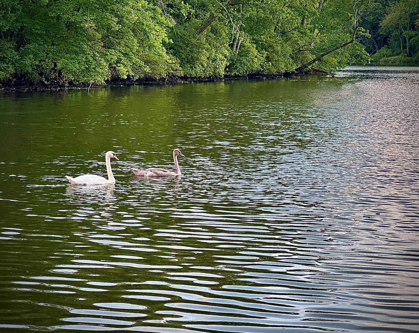 Three swans — two white males and one gray female — hang around the pier next door, which at some point broke in half, leaving the swans, ducks, and Canada geese that arrive each morning on a weathered wooden island unmolested by two or four-legged creatures. They preen, hop off to hunt for breakfast, squawk, and swim as I watch from a screened back porch while drinking coffee. A single mallard duck hangs with the swans on the island pier.