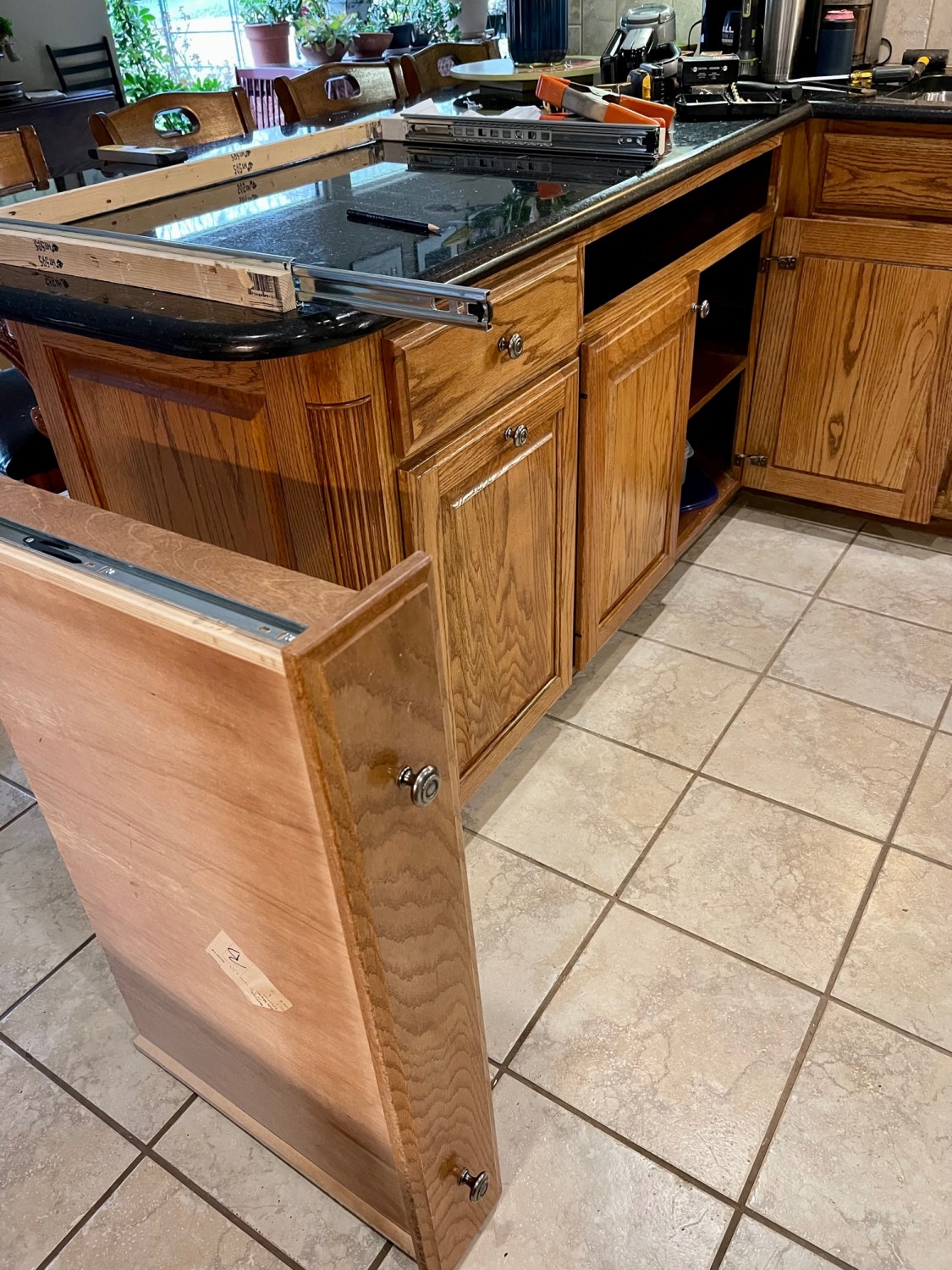 One thing I have learned over many decades of fixing things is that getting it right the first time — for me — is the exception, not the rule. I have learned to accept that it is likely I am not going to succeed in fixing a running commode the first try – a rare dive into plumbing I am willing to attempt. Thus, when the drawer first stuck, and then when yanked harder by my Beautiful Mystery Companion tilted up into the air at an angle that screams, “I’m broken again,” I knew how I would be spending last Saturday.
