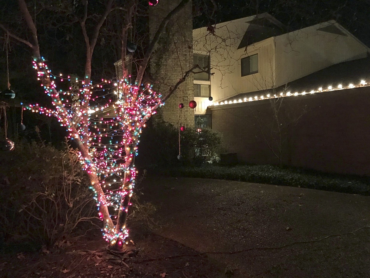 Christmas awaits. The hardwood trees are bare, the grass brown. Our neighborhood is awash with Christmas lights. Driveways are beginning to fill with the vehicles of families coming home for the holidays. As always, my Beautiful Mystery Companion has beautifully decorated our house while I wisely stay out of the way. My job is to hang the lights outside, treading carefully on the roof. I then wrap our outdoor Charlie Brown Christmas tree with 300 feet of colored lights and hang ornaments from the branches. I learned a few years back to caulk the top of each ornament, where the hanger dangles from the cap. Otherwise, the ornaments, which are large, fill with rainwater and crash to the ground.
