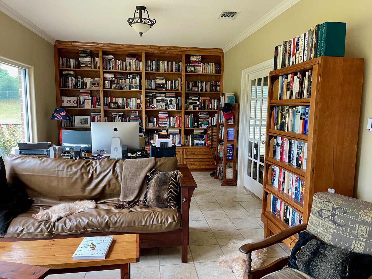 Despite giving away more than two dozen bank boxes of books to daughter Mere and the Estes Library at LeTourneau University, where I began working in person again this week, the collection I kept filled all the shelves in the new home, as well as the bookcases we brought here. As I said previously, building a barrister bookcase remains high on the woodworking to-do list. Buying books is a habit I do not intend to break.