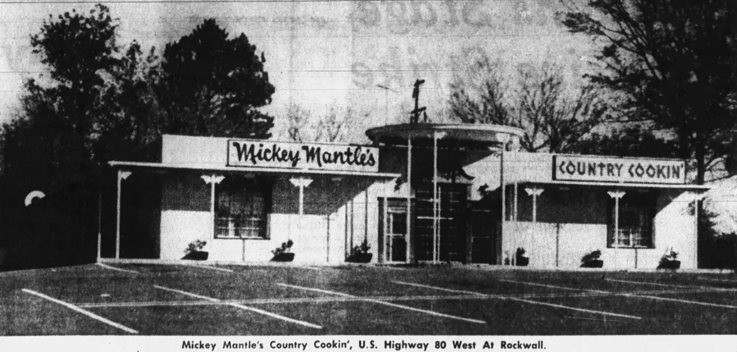 Mantle and his backers had big plans for Mickey Mantle’s Country Cookin’. A newspaper article noted local hotelier Bruce Cunningham planned to open 10 more restaurants throughout East Texas and the Dallas area. According to an SEC filing, besides chicken and dumplings, the restaurant featured chicken fried steak, chili, ham and lima beans and a country pork sausage sandwich. Plates were $1.25, and sandwiches were a buck.