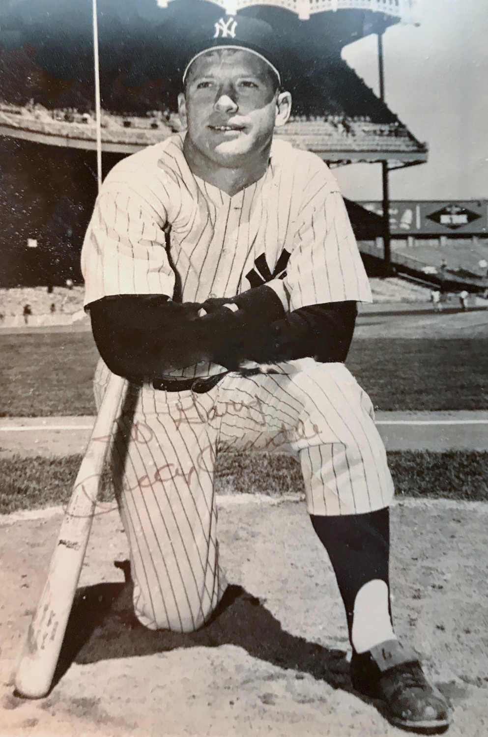 My parents took my brothers and me to see Mantle. We were fervent Red Sox fans who generally regarded the Yankees as the enemy. But, after all, this was Mickey Mantle. He sat at a table in the foyer of the restaurant, signing a stack of black-and-white 8×10 photos of himself in uniform, kneeling in the batter’s circle in Yankee Stadium. The photo today hangs in my study, the ink faded a bit but still visible, as seen in the accompanying digital version: To Gary. Mickey Mantle.