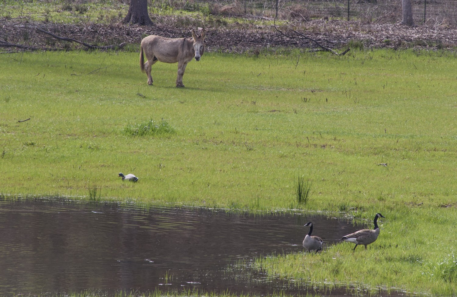 I was seated at my computer, as usual, when I heard them honking and watched them glide to a smooth landing in Pancho’s Pond. They stayed long enough for me to snap the photo, then took off again. I later headed to the feed store to get a sack of cracked corn, in hopes of enticing them to linger a bit longer. Until this week, the only regular visitor to the pond is a Great Blue Heron, who also spends some time standing motionless in the front pasture, which doesn’t have a pond.