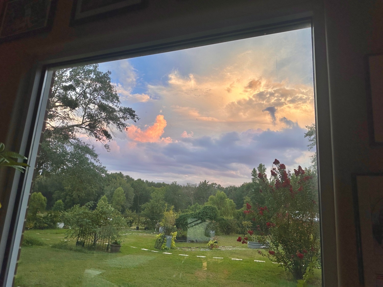 A photo of the view from my window during a late-July gloaming accompanies this piece. The southern sky glows with colors not often seen in summer, when days in East Texas are usually spent beneath cloudless skies. The small, fenced backyard is well-manicured. The crape myrtle glows a deep scarlet, the potato plants a luminescent lime green. But it is the light in the sky, reflecting a setting sun, that makes this view magical, at least to me during the gloaming.