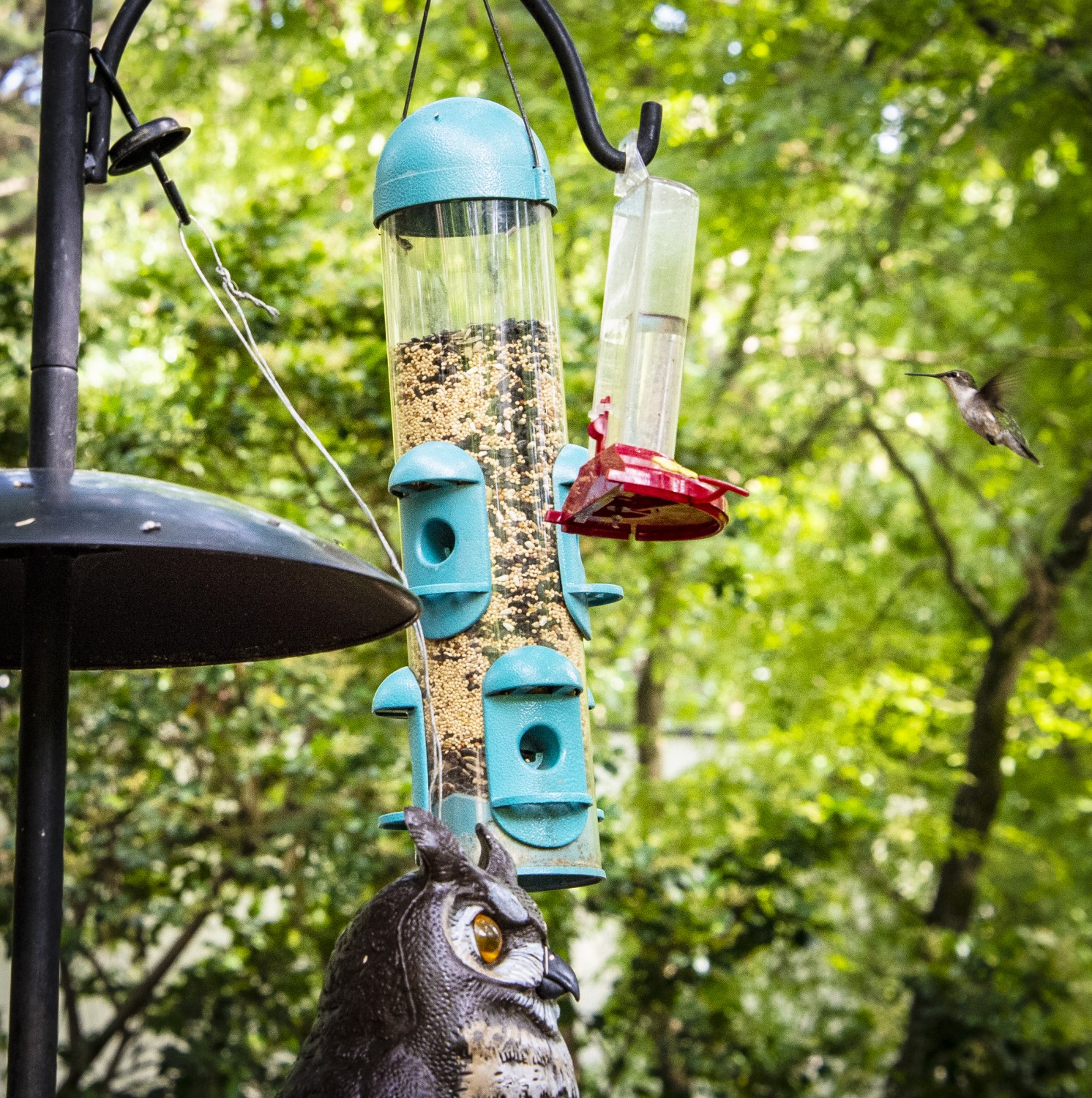 As most of you know, squirrels are the nemesis of bird feeders. My BMC has a cage feeder into which you put a square cake of bird seed, which the wrens and chickadees enjoy — but not as much as the squirrels. I installed a baffle that theoretically keeps squirrels from getting onto the feeders. It didn’t work with the cage feeder. One squirrel in particular would leap on top of the cage and hang upside down, munching away at the cake until one of us ran outside and yelled at him. Next, I tried hanging a large plastic owl bought years ago from the same pole, in hopes it would scare the squirrel. The squirrel returned and spent about 15 minutes eyeing the owl. He even walked over, touched it and leaped back when it swayed from the pole. Ha! I thought. This might work.