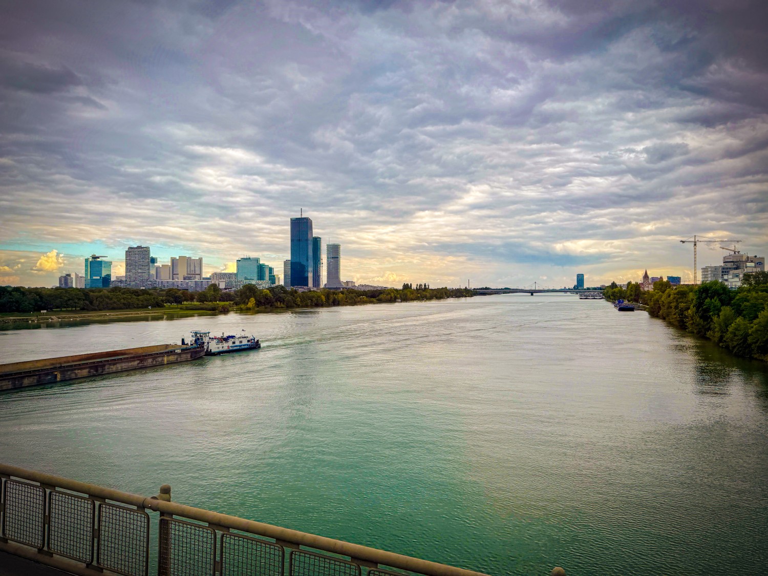 The tour crossed the Danube River, where a lone tugboat was pulling a barge. The Danube flows for 1,770 miles through 10 countries, from the Black Forest in Germany through the Danube Delta in Romania, eventually emptying into the Black Sea. Along its banks stands the Donaupark-Aussichtsturm (Danube Park Observation Tower), built in 1964 for an international garden exhibition. Several construction cranes loomed behind it — modern Vienna is experiencing a building boom.