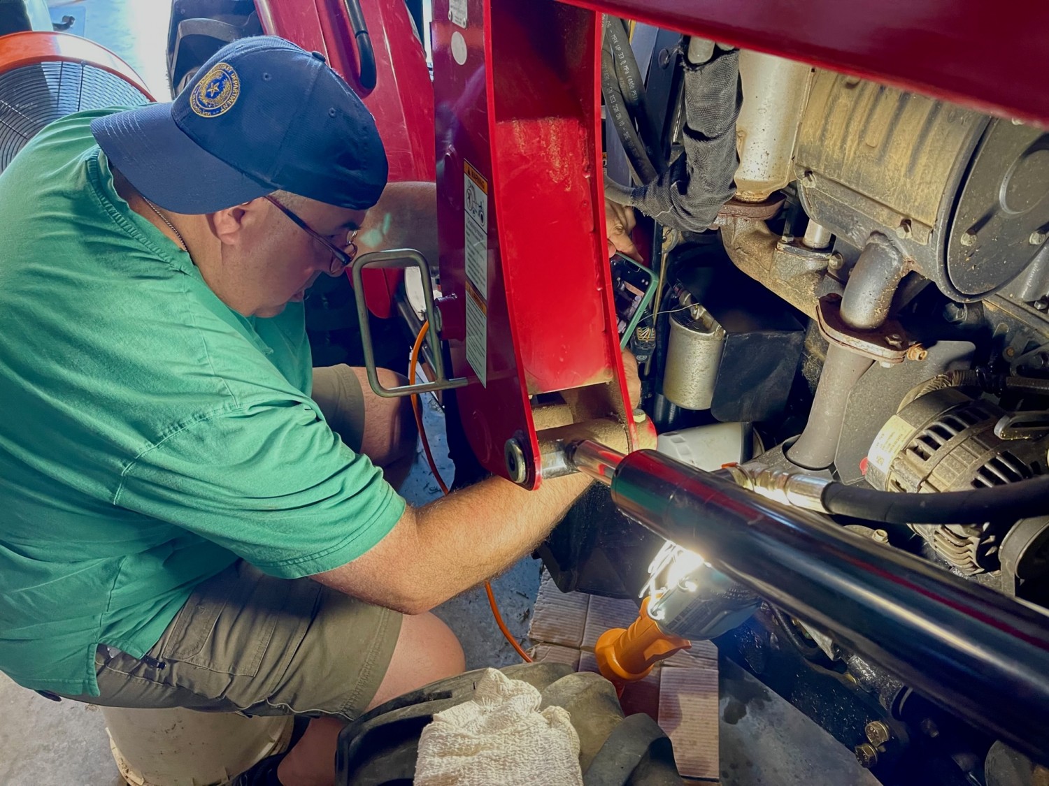 “Tractors just leak,” he said in a philosophical tone. He pointed out that through bushhogging, picking up tree limbs with the bucket, pushing around piles of brush with same, Little Red does more shaking than Chuck Berry did on stage singing Johnny B. Goode. Bolts loosen, hose clamps lose their grip, seals comes loose. Soon, slow leaks commence.